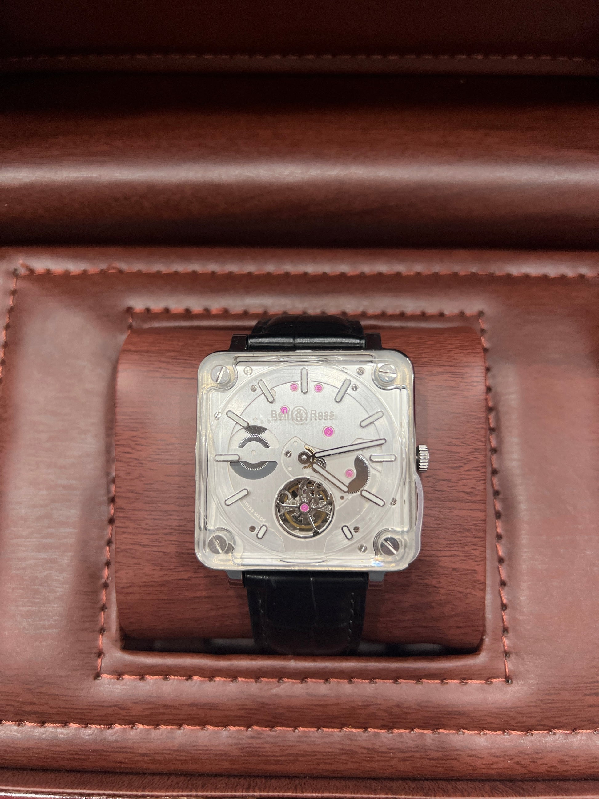 Bell & Ross's BR-X2 Tourbillon Micro-Rotor is a sleek fusion of innovation and elegance, pushing the boundaries of traditional watchmaking. The floating tourbillon movement is showcased in a sapphire crystal case, with a slim, lightweight profile and exceptional performance thanks to the automatic micro-rotor. The skeletonized dial displays the intricate mechanics, making it a must-have for collectors of fine timepieces. An architectural marvel of modern luxury in haute horology.