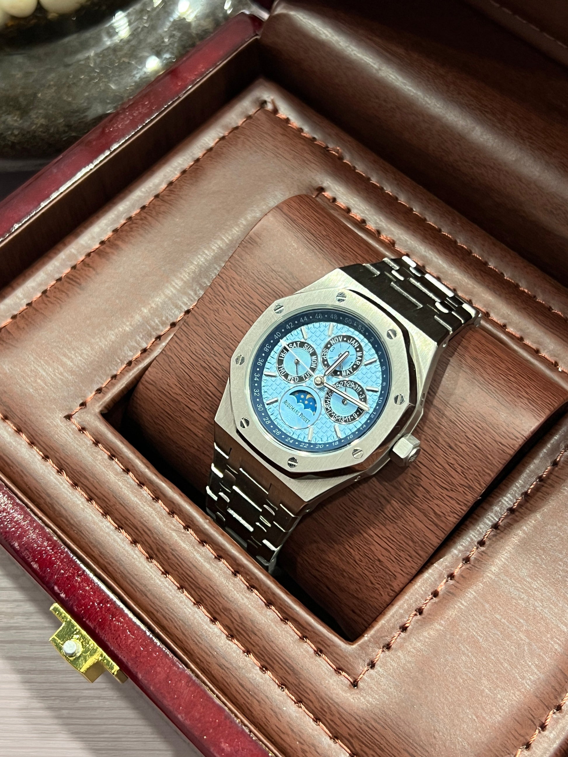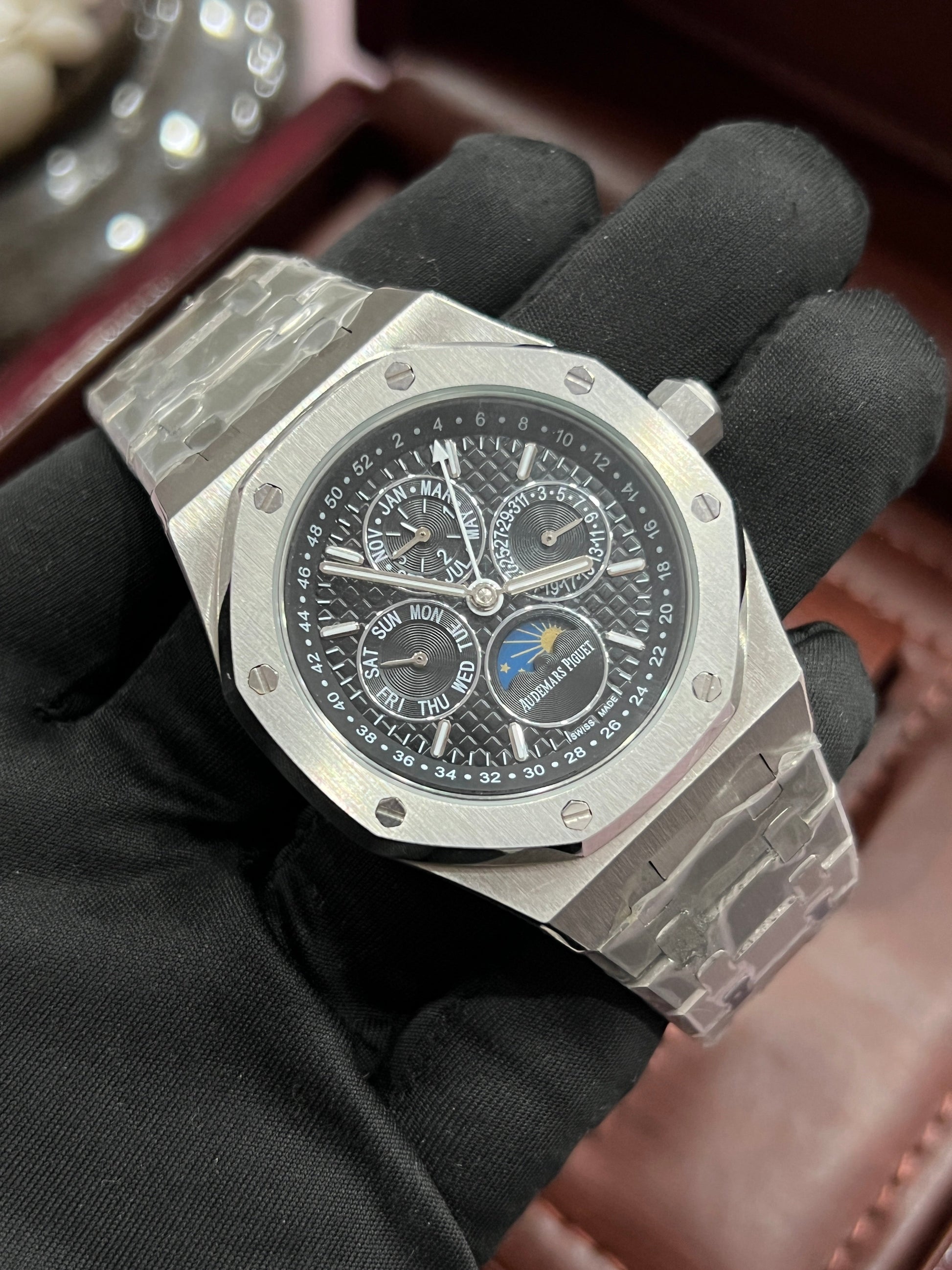 This Audemars Piguet Perpetual Calendar Open Worked watch showcases a silver and black dial with a sleek automatic movement. Its intricate design provides a timeless appeal, perfect for any style. Stay punctual and make a statement with this expertly crafted timepiece.
